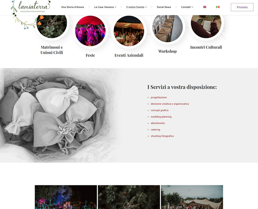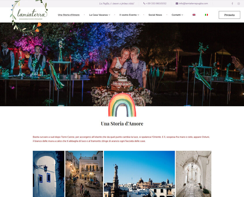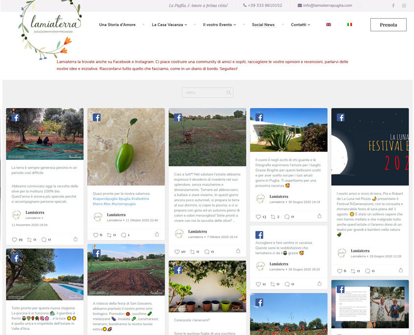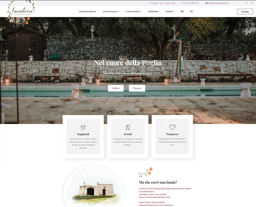 Un’antica lamia ristrutturata, con piscina e giardino, in grado di ospitare sino a 7 persone, per trascorrere un piacevole soggiorno o organizzare un evento nelle campagne pugliesi. Realizzazione sito multilingue, con layout full responsive, comunicazione Facebook integrata tramite un social wall personalizzato multilingue, arricchito dalla creatività dell’illustratrice Lucia de Marco.