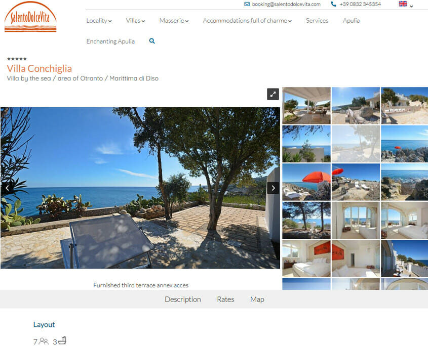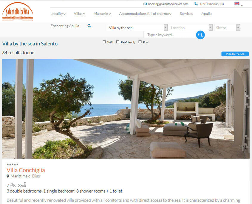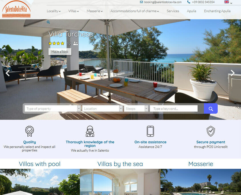Splendide dimore di charme in affitto per un indimenticabile soggiorno in Salento. Un sito full responsive, veloce e dotato di strumenti moderni per la ricerca e la visualizzazione delle gallerie fotografiche, che offre una navigazione piacevole e una presa di contatto rapida. Nello sviluppo rientra un pannello di amministrazione completo di funzionalità CRM e gestione delle transazioni online. Il progetto è il risultato di una collaborazione con Oltremare Casa s.r.l. in pieno spirito di partnership e di passione condivisa nell’offrire un servizio di qualità. Sito ottimizzato per il posizionamento sui motori di ricerca.
